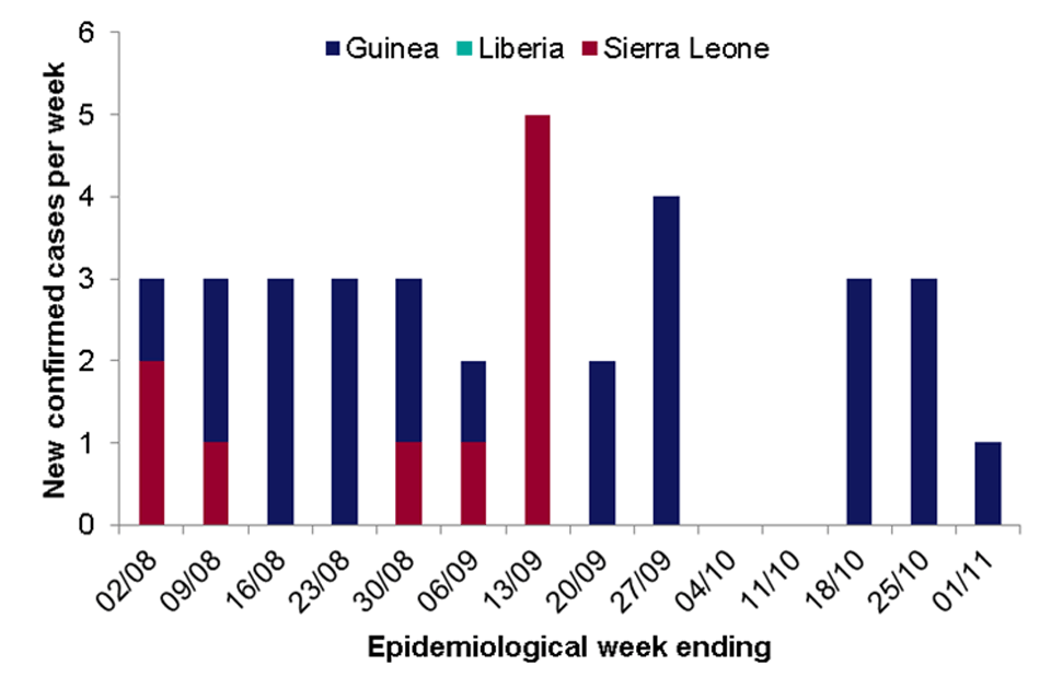 Number of new confirmed cases reported per week (25 October to 1 November 2015) in affected countries in West Africa. (Data source: WHO Ebola Situation Report 4 November 2015)