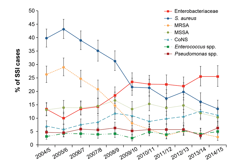 Staphylococcus Aureus accounted for 13% of inpatient SSIs in 2014/15 following a decreasing trend since 2006/7 due to decreases in methicillin-resistant S. aureus (MRSA) which now account for 3% of SSI. Enterobacteriaceae increased from 2008/9 and accounted for 25% of SSIs in 2014/15