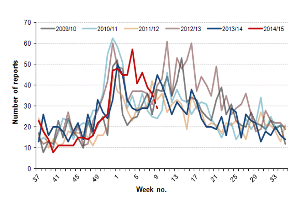 The number of routine laboratory reports of iGAS has increased in line with normal seasonal patterns. While sharp increases were seen around week 4, iGAS reports are now within normal levels (figure 3). A total of 672 cases of iGAS infection were reported so far this season (week 37, 2014, to week 9, 2015), slightly above average for the same period over the last 5 years (641) but within the reported range for this period (562 to 708).