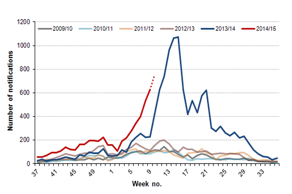 Routine monitoring is showing week-on-week increases in scarlet fever notifications as we approach the height of the season with 754 notifications for patients in England in week 10 of 2015. This brings the total number of notifications of scarlet fever made to Public Health England (PHE) so far this season (weeks 37, 2014, to 10, 2015) to 5746, compared with 2833 to for the same period last season (figure 1).