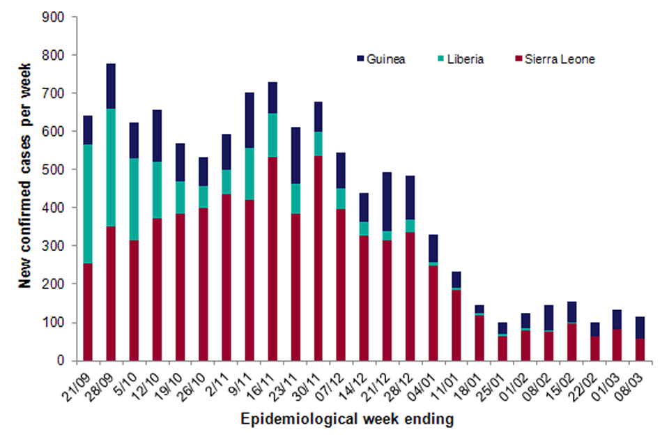 Number of new confirmed cases reported per week (21 September 2014 to 8 March 2015) in countries reporting persistent transmission