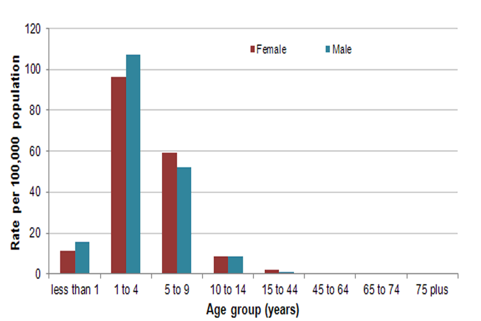 The age distribution of scarlet fever cases notified this season remains similar to previous years, with 89% of cases reported in children under 10 years of age (median 4 years; range <1 year to 87 years). Notifications are evenly distributed by sex across all age groups. The incidence of scarlet fever in children ranged from 8.8 per 100,000 population in 10 to 14 year-olds to 111.0 per 100,000 population in 1 to 4 year-olds this season (figure 2). Five per cent of notifications this season were in adults (≥18 years old) with rates of <1 per 100,000 population in those over 44 years old.