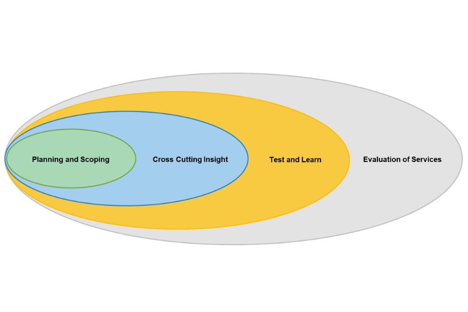 The Test and Learn layer ensures that when we test new ideas, we are testing the right things at the right times and feeding the learning into Programme feedback loops to influence design and delivery decisions (see the section on Evaluation of Services).