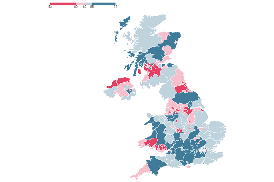 Healthy life expectancy varies depending on where you live. The map shows that local areas of low healthy life expectancy tend to be clustered: seen in South Wales, Eastern Scotland, Northern Ireland and parts of the north of England.