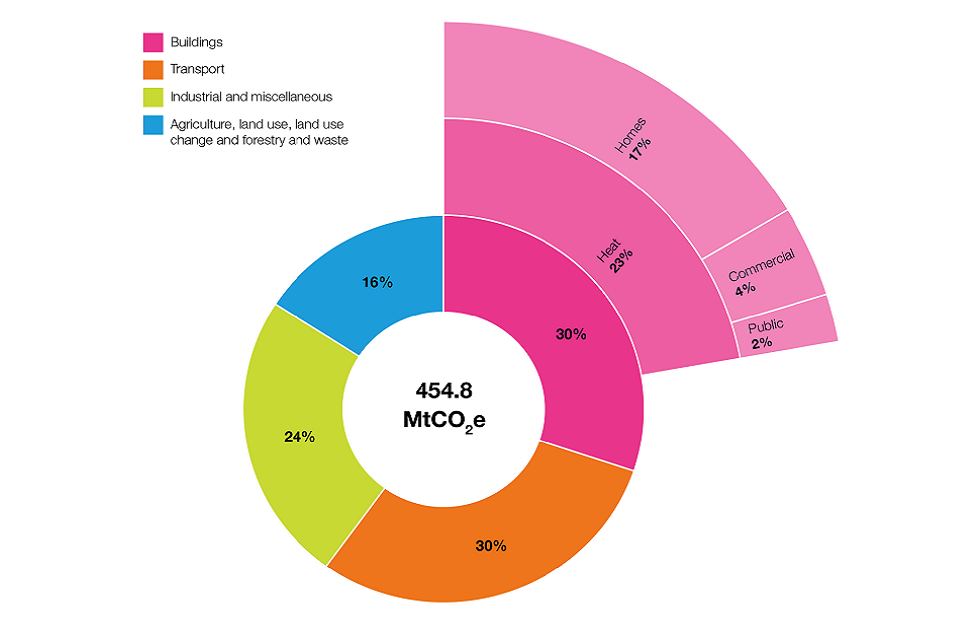 Figure 2 shows the proportion of emissions in 2019 from buildings to the nearest whole number; of the 454.8 mega tonnes of carbon dioxide equivalent (MtCO2e) total emissions, 23% were due to heating buildings, with the largest proportion of this stemming from homes. [footnote 35]