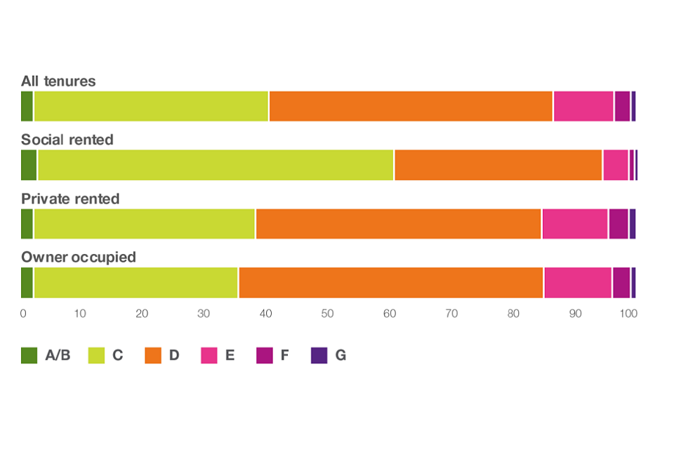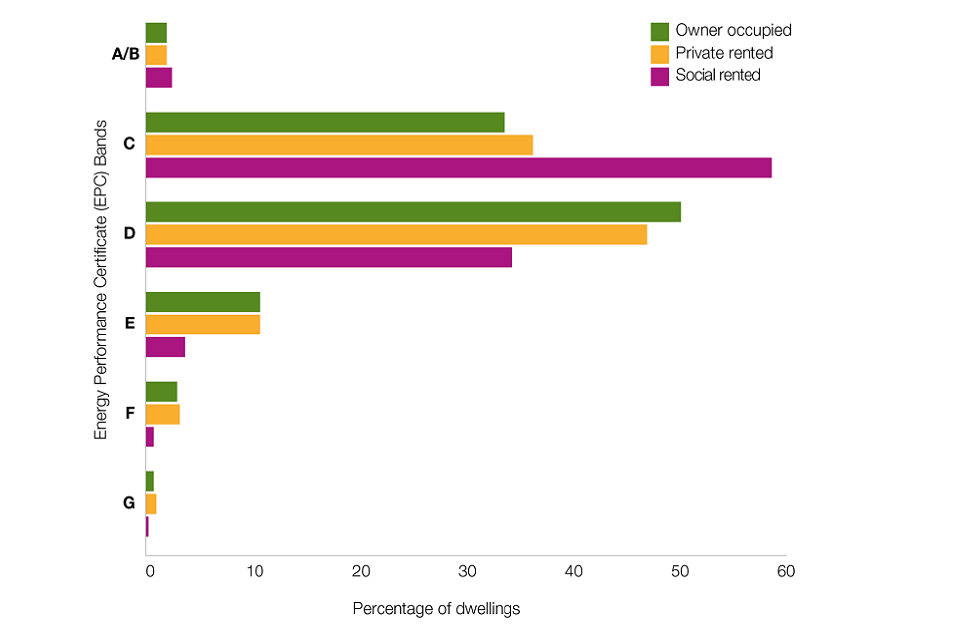 The Welsh Housing Quality Standard includes a minimum energy standard of EPC band D. Currently over half of social homes are EPC band C or better as a result of this standard. ↩