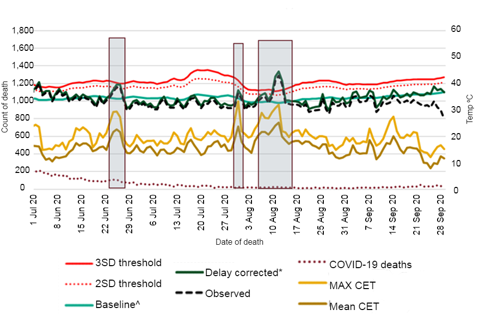Excess all-cause mortality was calculated by comparing the average number of all-cause deaths (corrected for delays in registration) on heatwave days with the average from the combination of the 7 non-heatwave days preceding and subsequent to the heatwave period, having subtracting the estimated number of deaths attributed to coronavirus (COVID-19) on those days.