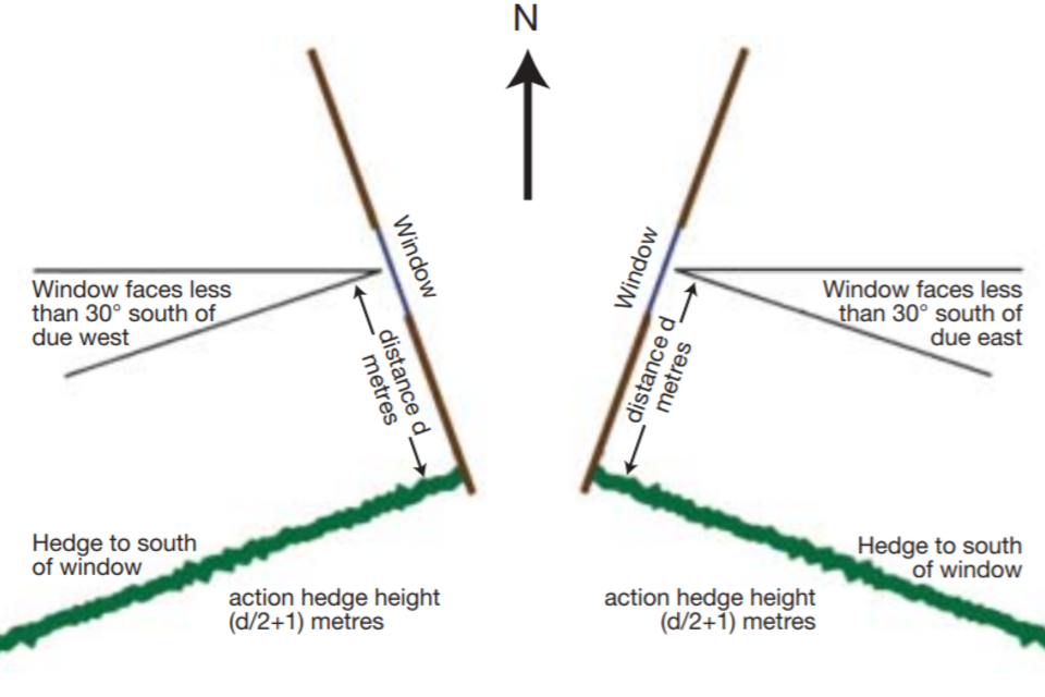 For daylight to windows of dwellings, the guidelines are based on those in the BRE Report ‘Site layout planning for daylight and sunlight: a guide to good practice’, except that the angular criteria have been replaced by spacing to height ratios for ease of application. The aim here has been to concentrate on daylight provision on cloudy days. Where the hedge is opposite a window that faces within 90° of due south, it can be shown that there is little obstruction to sunlight if the guidelines are followed.