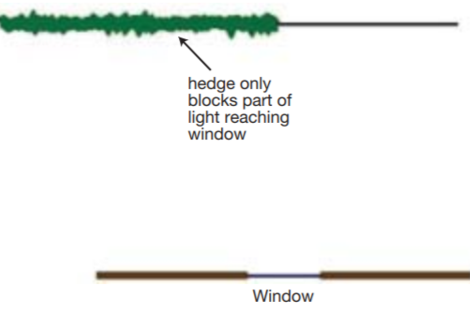 The effect of gaps in the hedge. Where the window is opposite the gap, it can receive daylight through it. A window at an oblique angle may receive little or no light through the gap because of the depth of the hedge.