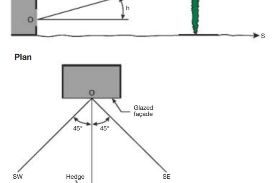 Reference 3 explains that the key area for solar access in winter lies within 45° of due south. This means that hedges to one side of the window are unlikely to have a substantial effect. Hedges opposite the window, however, will block solar access if they subtend more than the critical angle h to the horizontal measured from the centre of the window. A value of h = (70°-site latitude) (ref 3) is recommended. This would give an obstruction angle of 18.5° in the London area and 14° in Edinburgh or Glasgow.
