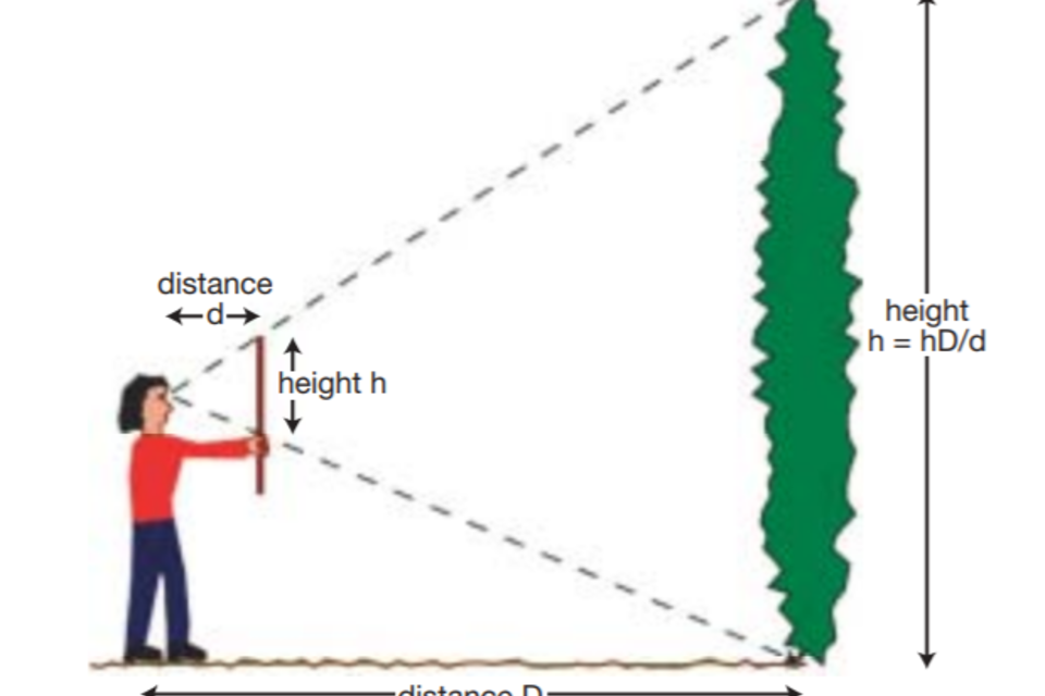 Alternatively, take a straight stick and stand some distance away from the hedge. Hold the stick vertically at arms length (get someone else to check it is vertical). Keeping the stick vertical, hold it so the top of the stick is aligned with the top of the hedge and the top of your fist is aligned with the base of the hedge (figure 13). Then the height of the hedge is given by the horizontal distance between you and the hedge trunk, multiplied by the length of the stick above your fist, divided by the horizontal distance between your eye and the stick (get your assistant to measure this).