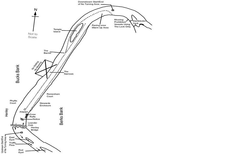 All boats travelling downstream must be navigated within the regatta course and all boats travelling upstream must be navigated on the Bucks/Fawley side of the regatta course. Except from 7am on Friday 7 July to 6pm on Saturday 8 July and 8am to 3pm on Sunday 9 July (when the navigation channel for all river traffic will be on the Bucks/Fawley side of the regatta course).