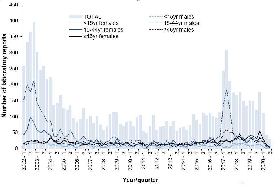 Notes: From Q1 2020, the central number of cases presented excludes false positives and includes additional cases identified by the VRD. Hence, numbers are not directly comparable to previous quarters. False positives are more likely in older age groups.