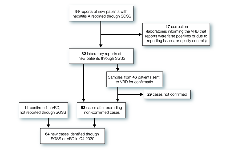 The following flowchart shows there were 99 reports of new patients with hepatitis A reported through SGSS. There were 17 corrections (laboratories informing the VRD that reports were false positives or due to reporting issues, or quality controls), leaving 82 laboratory reports of new patients through SGSS. Samples from 46 patients were sent to VRD for confirmation and 29 cases were not confirmed. After excluding non-confirmed cases, 53 cases remained. Eleven cases were confirmed in VRD but not reported through SGSS, giving a total of 64 new cases identified through SGSS or VRD in Q4 2020.