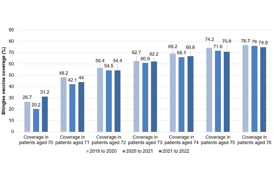 Cumulative shingles vaccine coverage for all adults aged between 70 and 80 years old continues to increase year on year through opportunistic vaccination.