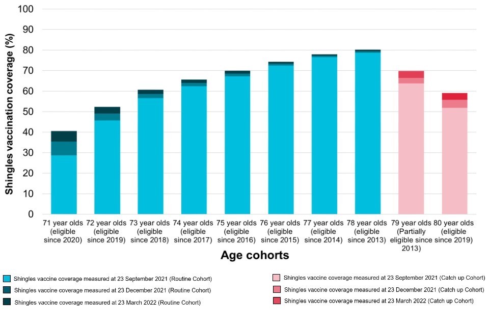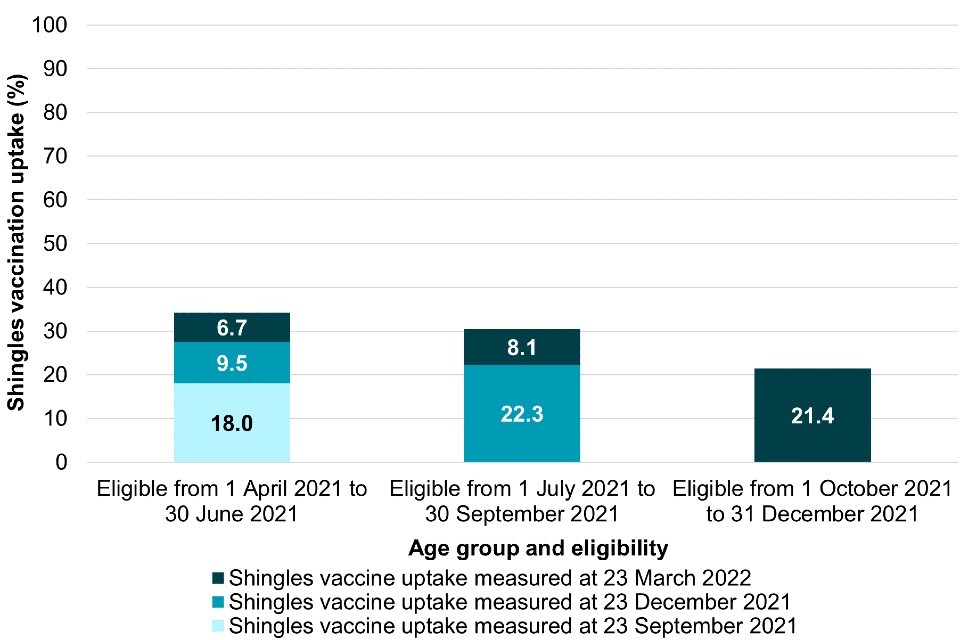 Shingles vaccine coverage report (adults eligible from April to December 2021 and vaccinated to the end of March 2022): England Quarter 3 of 2021 to 2022