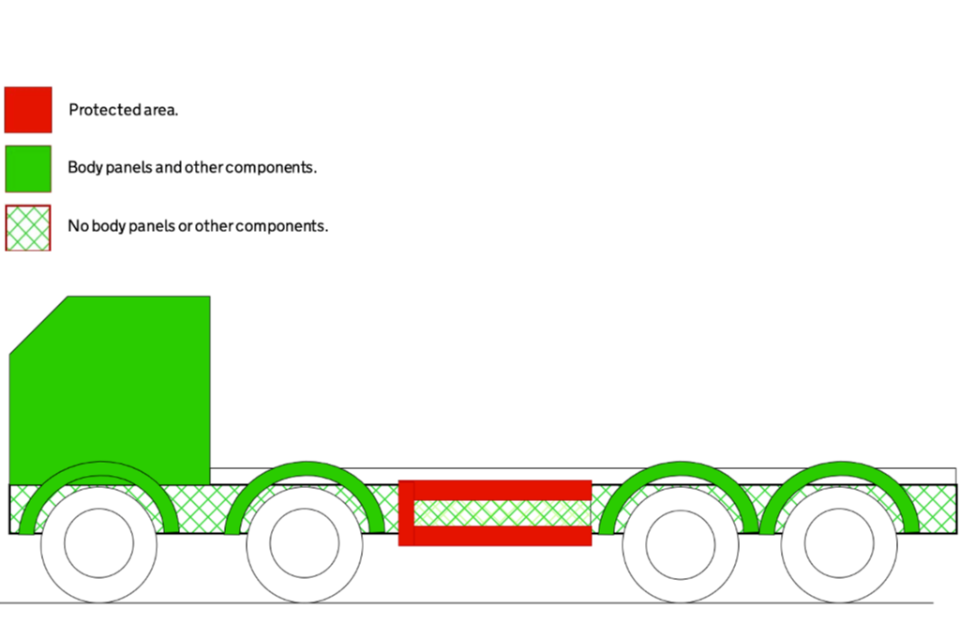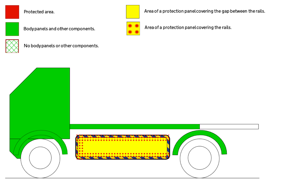 Diagram 1: A 2-axle vehicle where the protected area is covered by two horizontal rails. Sometimes there is only one rail.