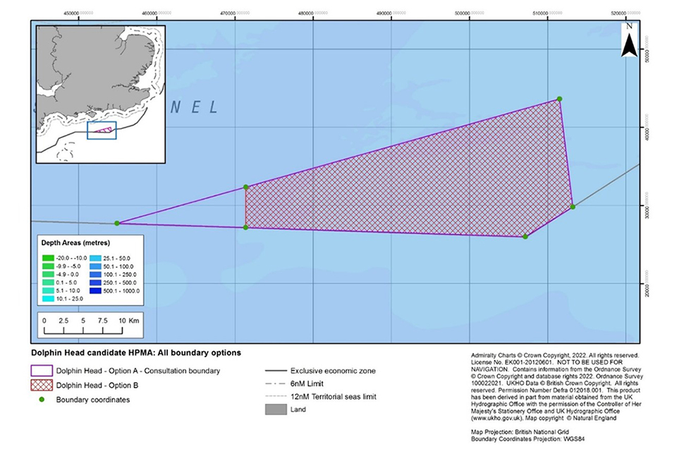Figure 3 – Dolphin Head candidate HPMA: The map shows 2 boundary options for the Dolphin Head site. Option A, the original consultation boundary (508 km2) alongside Option B, the preferred option (462 km2) which excludes an area in the south-west corner facilitating compliance and enforcement by avoiding an acute angle in any final site boundary.
