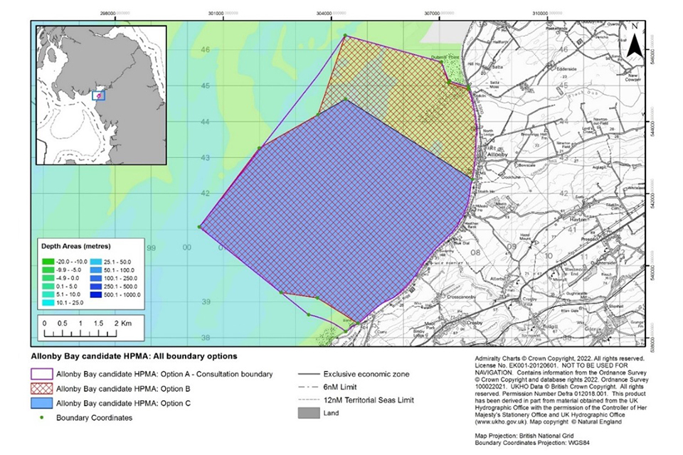 Figure 2 - The map shows 3 boundary options for the Allonby Bay site. Option A, the original consultation boundary (38.5 km2), Option B which excludes the Maryport Harbour and Port of Silloth (36.5 km2), and Option C, the preferred option which allows certain specified activities such as angling to continue to take place outside of the HPMA boundary (27.6 km2).