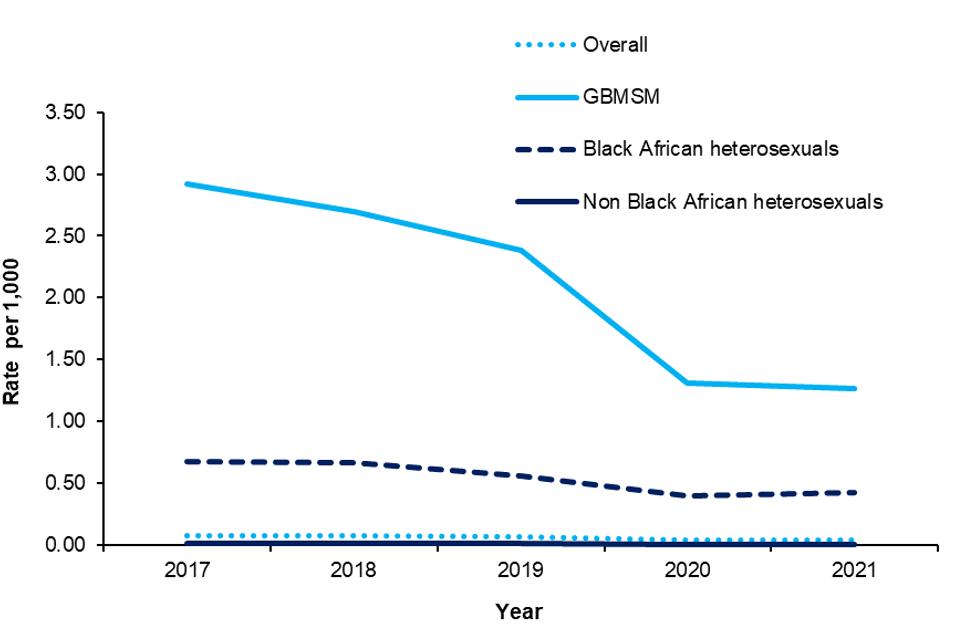 On 1 December 2021, England’s government published an HIV Action Plan, an initiative which sets out the activities that need to be undertaken to meet England’s long-term commitment to zero new HIV transmission by 2030 (1). England is well placed to achieve this. New HIV diagnoses first made in England have decreased since 2015, particularly in GBMSM, due to high sustained levels of HIV testing (including frequent repeat testing), the availability and effectiveness of PrEP, the effectiveness of treatment as prevention (TasP) and excellent care provision by the NHS. In addition, since 2020 (2), England has met the UNAIDS 2025 targets (3) of 95% of all people with HIV being diagnosed, 95% of those diagnosed on treatment and 95% of those on treatment being virally suppressed and so unable to pass on the virus.