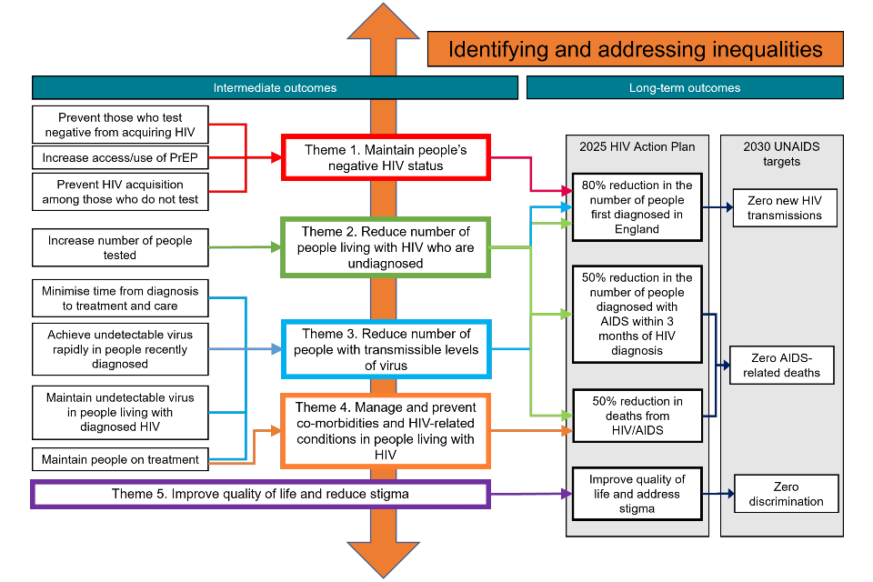 Each theme is accompanied by a provisional set of indicators. These have been drawn, where available, from existing published metrics and developed using existing data sources. Sources include the Sexual and Reproductive Health profiles (5), the NHS England Specialised Services Quality Dashboards (6), the PrEP monitoring and evaluation framework (7), the 2025 UNAIDS targets (8) and the British HIV Association (BHIVA) standards of care (9). The definitions for indicators and targets for the HIV Action Plan are presented in Appendix 1.