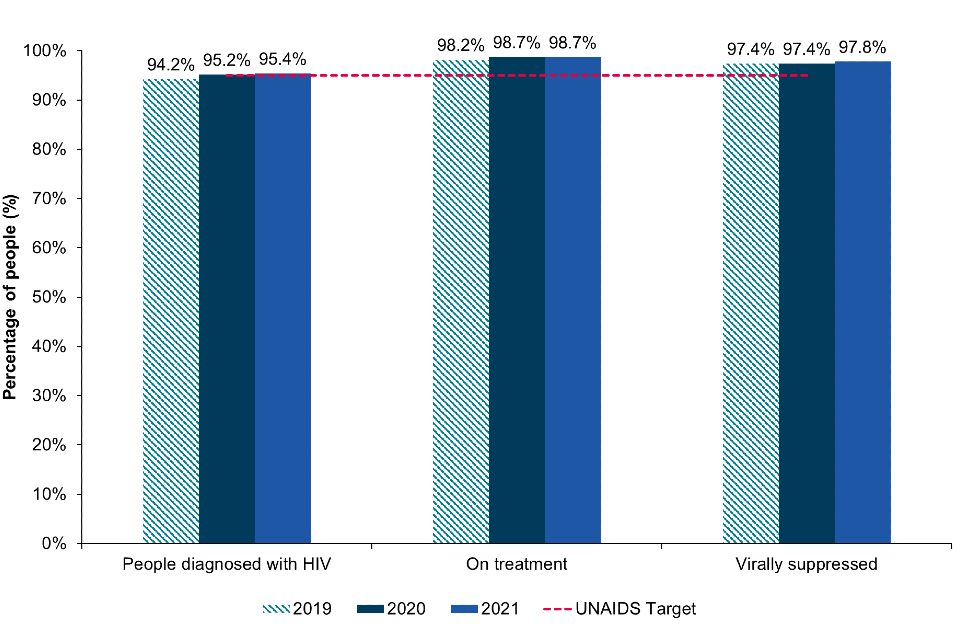 In 2021, England has met the UNAIDS 2025 targets for the second time with 95% of all people with HIV being diagnosed, 99% of those diagnosed on treatment and 98% of those on treatment being virally suppressed and unable to pass on the virus.