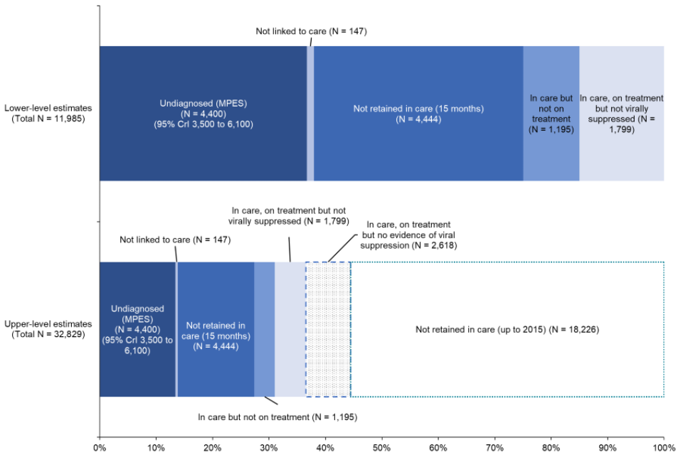 A higher-level estimate for the number of people living with transmissible levels could reach up to 32,829 in 2021 when including 2,618 people on treatment with no evidence of viral suppression and an additional 18,226 people not retained in care (more than 15 months since last appointment between January 2015 and October 2019).