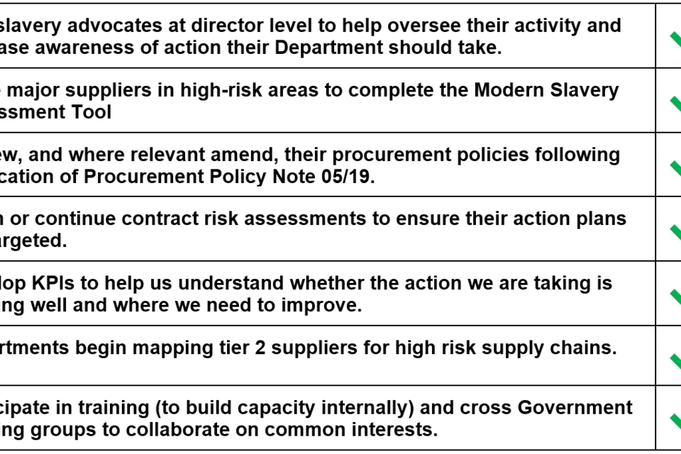 KPI 1 – 100% of Commercial Directorate Staff will have undertaken the new Home Office Modern Slavery Unit’s eLearning course by 31st March 2022. New joiners to the Commercial Directorate to undertake the course within one month of joining.