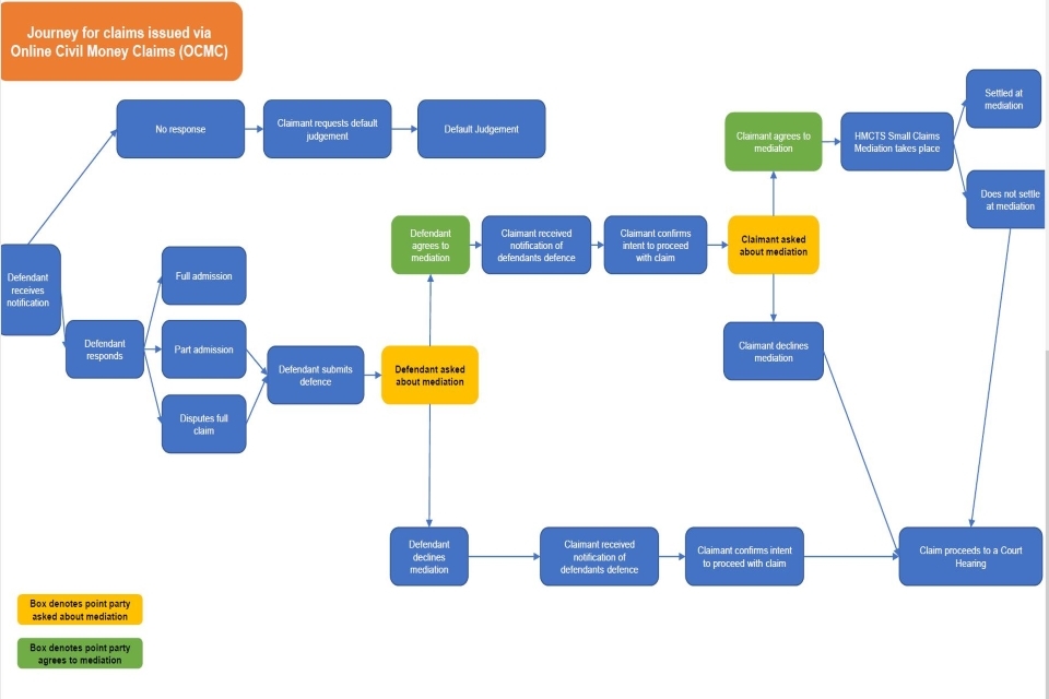 See Annex A for a simplified overview of the journey of a small value specified civil money claim and the stage at which both the claimant and defendant are asked about their willingness to go through mediation within OCMC.