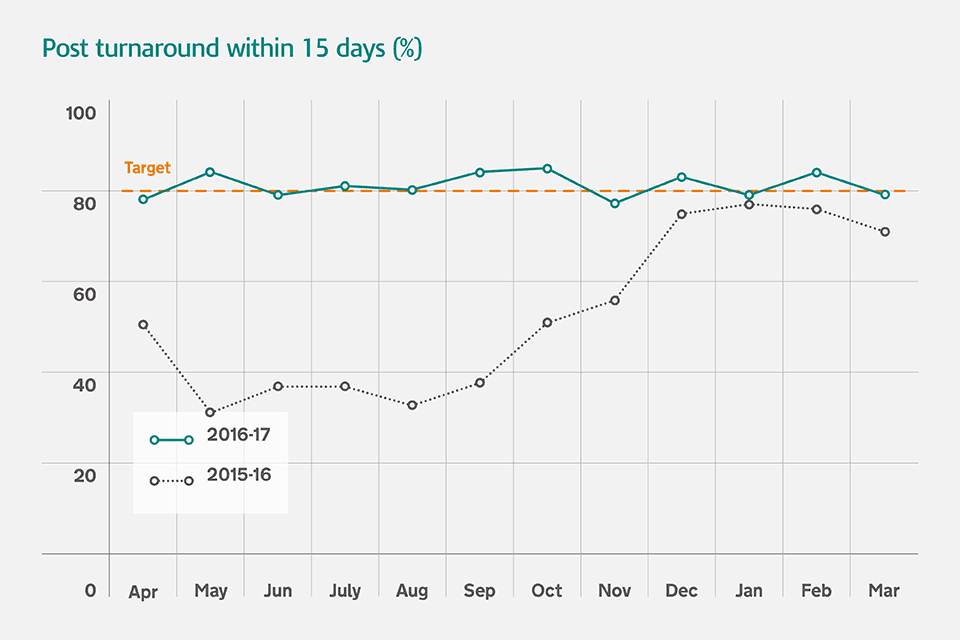We are transforming the UK’s tax and payments system with simple, secure and personalised digital services for our customers that helped deliver our best ever performance last year. We exceeded our targets across the board. More than 80% of customers told us they were ‘satisfied’ or ‘very satisfied’ with our digital services. More than nine million people accessed their Personal Tax Account. We handled more than 1.6 million webchats, and saw 92% of Self Assessment customers submit and pay their return online – more than ever before. For the first time we offered a permanent seven day a week service across our main helplines to make it easier for customers to contact us at a time that suits them. We answered customer calls in an average of under four minutes and exceeded our target for turning round customer post while receiving fewer new complaints.