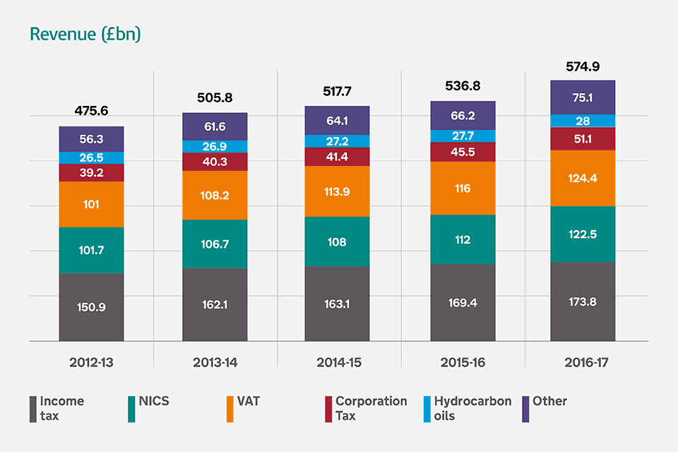 In 2016 to 2017, total revenue increased by £38.1 billion, or 7.1%, to £574.9 billion.