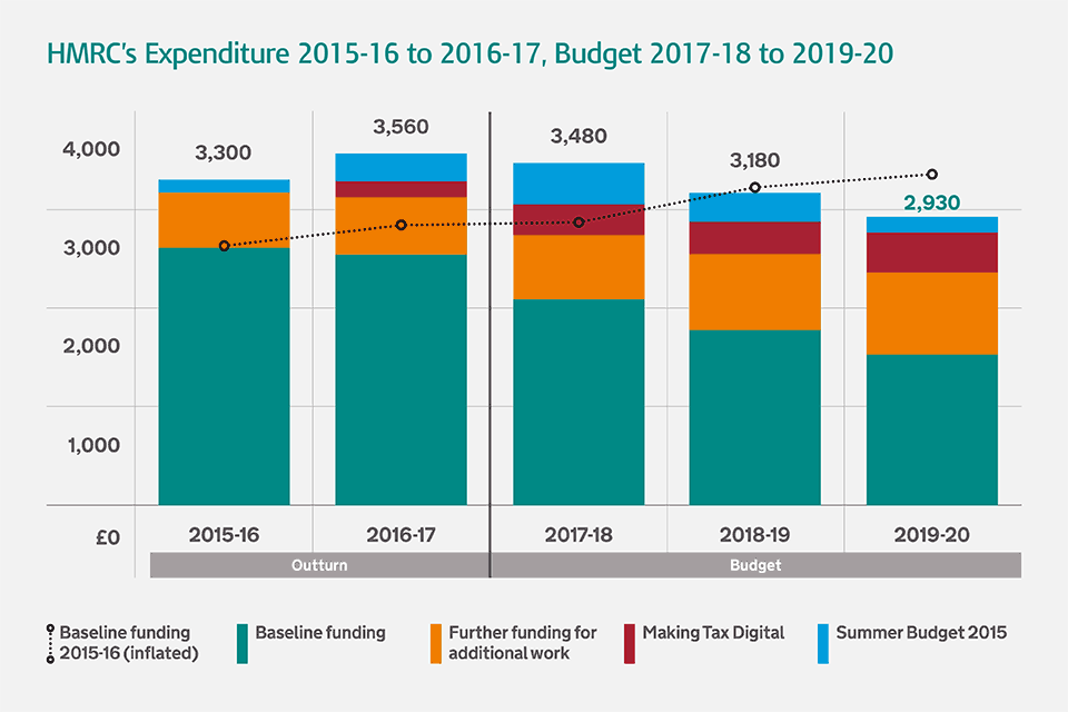 Figure 9: shows HMRC’s expenditure and budget 2015 to 2016, to 2016 to 2017, budget 2017 to 2018 to 2019 to 2020 (excludes depreciation)