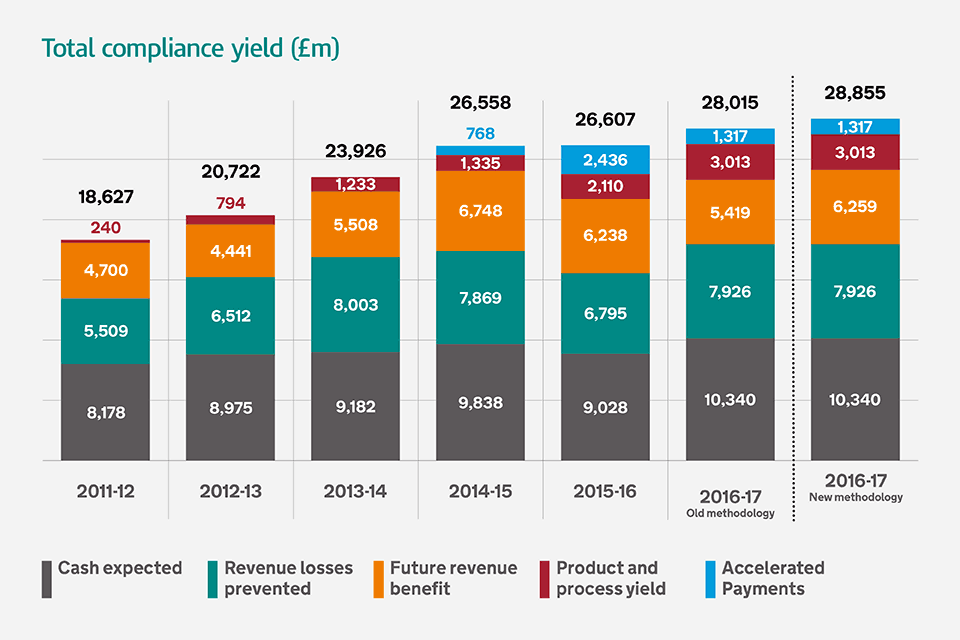 Compliance yield targets are set on an annual basis at the Budget. The 2016 to 2017 target of £27 billion was set on the new methodology for reporting future revenue benefit and was announced in the March 2016 Budget. We generated £28.9 billion against this target.