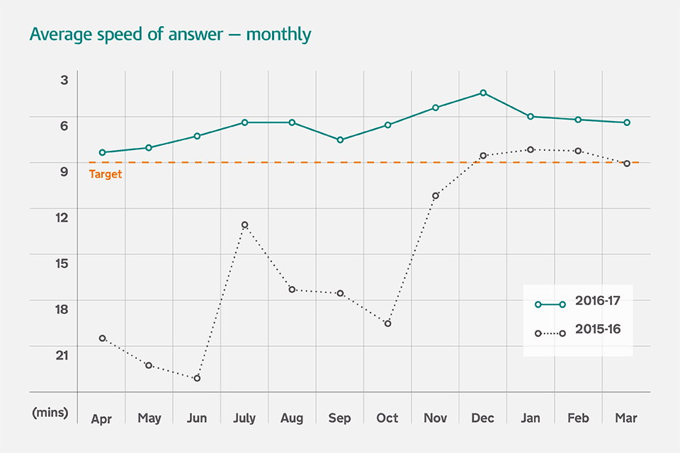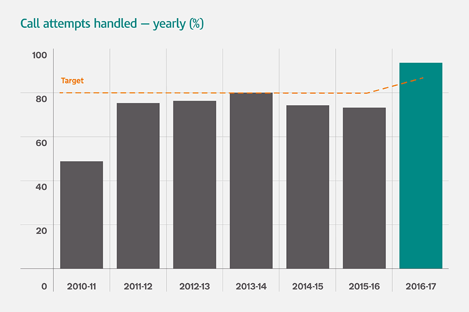 Our expanding online services gave customers newer, easier, faster and more convenient ways to interact with us. We worked hard to build new digital services as alternatives to traditional ways for contacting us and ensuring customers are aware of these options, while also delivering strong performance within the more traditional routes of contact, such as phone or post. To ensure we were able to effectively monitor our digital service performance, we introduced three new digital targets for 2016 to 2017, as well as a new customer helpline target focused on waiting times.