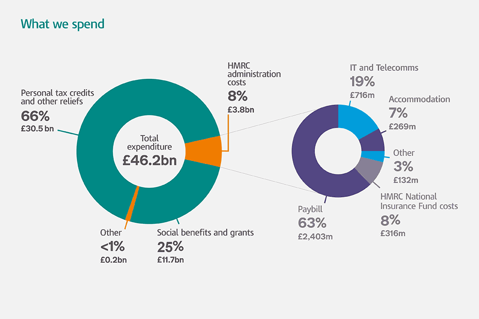 The main items that make up our payments to customers are tax credits and other reliefs (£30.5 billion or 66%) and social benefits and grants (£11.7 billion or 25%).