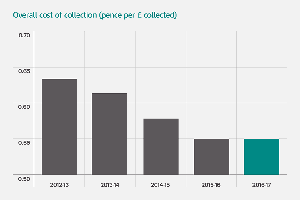The efficiencies we have delivered, together with increasing revenues, mean that the cost of collecting taxes in the UK is less than a penny for every pound collected – from 0.63 pence in the pound in 2012 to 2013 to 0.55 pence in 2016 to 2017 (ie every £100 we collect costs £0.55).