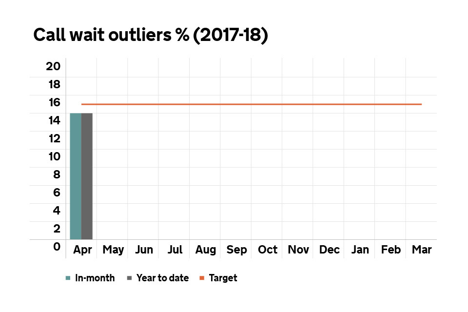| Call wait outliers | 14% | 0% | 14% | No more than 15% wait more than 10 mins |