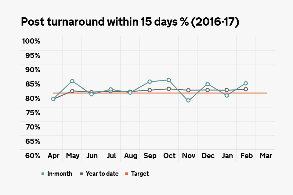 - Data for post handled within 40 days is one month lagged and shows January 2017 performance, the change from December 2016, and year-to-date figure to January 2017