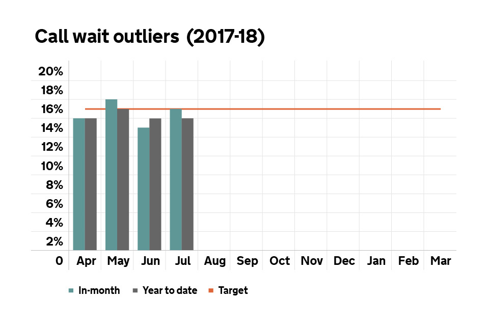 | Call wait outliers | 15% | + 2% | 15% | No more than 15% wait more than 10 mins |