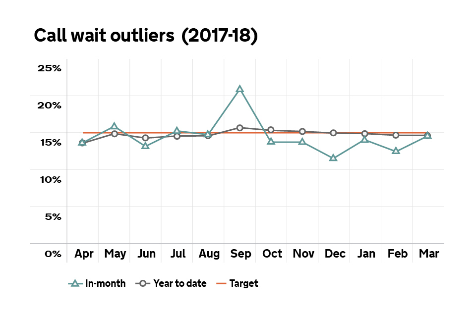 | Call wait outliers | 14.5% | + 2.2% | 14.6% | No more than 15% wait more than 10 mins |