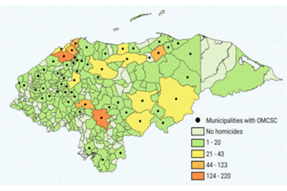 MS-13 and Barrio 18 are reported to be absolutely and relatively smaller in Honduras (upto 40,000, 0.4% of the population) than in El Salvador (60,000 members, 1% of the total population). As a consequence, gangs in Honduras exert less control. While there are no detailed figures on the extent of MS-13’s and Barrio 18’s control / influence in Honduras by taking gang-linked crime as a proxy for control, less than 75% of municipalities had a homicide (more than 25% did not), while 85% extortion is concentrated in just 5% of municipalities. In comparison in El Salvador sources describe gangs having control or exerting influence in over 94% of the country (see EMAP, Risk, Internal relocation and Gangs size and location)