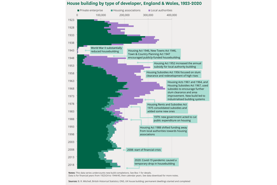 Around a third of homes are built on an affordable housing basis (c.30% in 2021/22), meaning they are sold or rented at a discount to the market price. The construction of these homes is typically either funded and procured by a public body, local government, or registered housing provider, or provided by housebuilders via planning obligations. As a proportion of total builds, England has relatively more speculative housing, and Scotland and Wales have relatively more affordable housing.