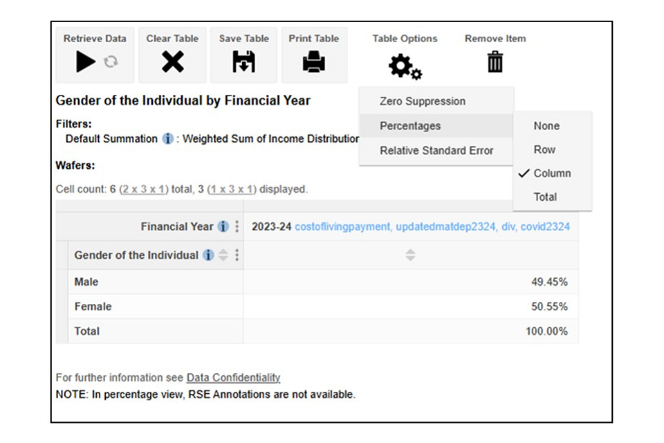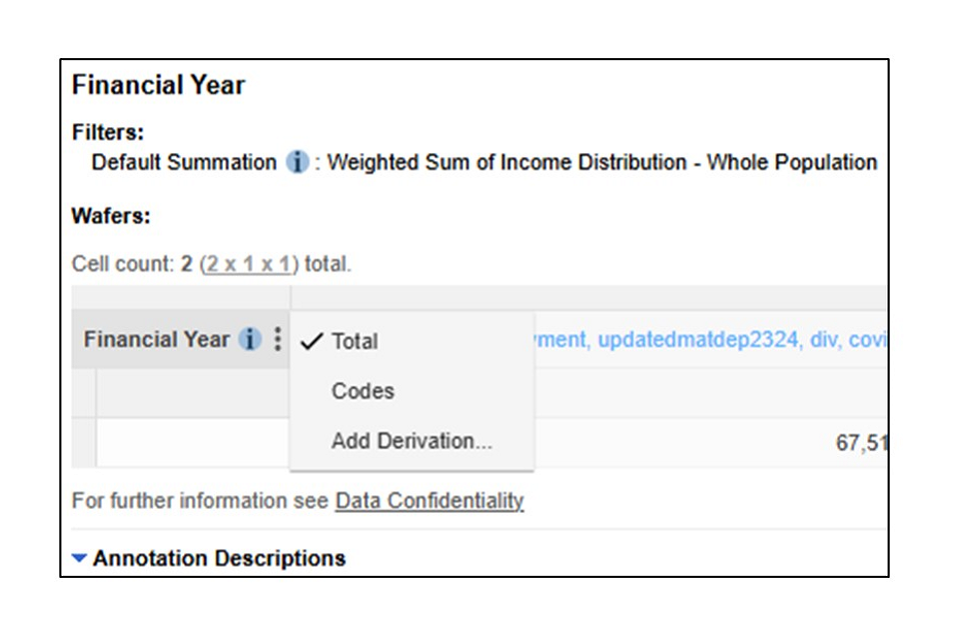 Careful selection of row and column categories are necessary to ensure correct estimates are produced - please see Section 12: User-defined Analysis and Section 13: Further Top Tips sections below.