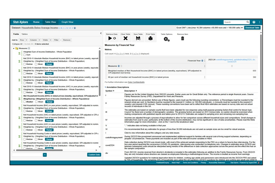Note: Options to calculate means and ranges are included as standard Stat-Xplore measures but the median measure is recommended as it is the same median amount for all individuals in a certain year. The purpose of this measure is to present a time-series of how net 2010-11 (FYE 2011) absolute median household income BHC and AHC has changed over time in year prices, whilst the value for latest year will be fixed across all individuals for all years as it is the net 2010-11 (FYE 2011) absolute median income in the latest survey year prices.