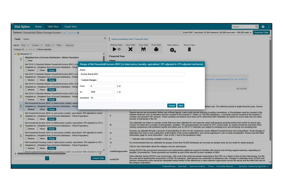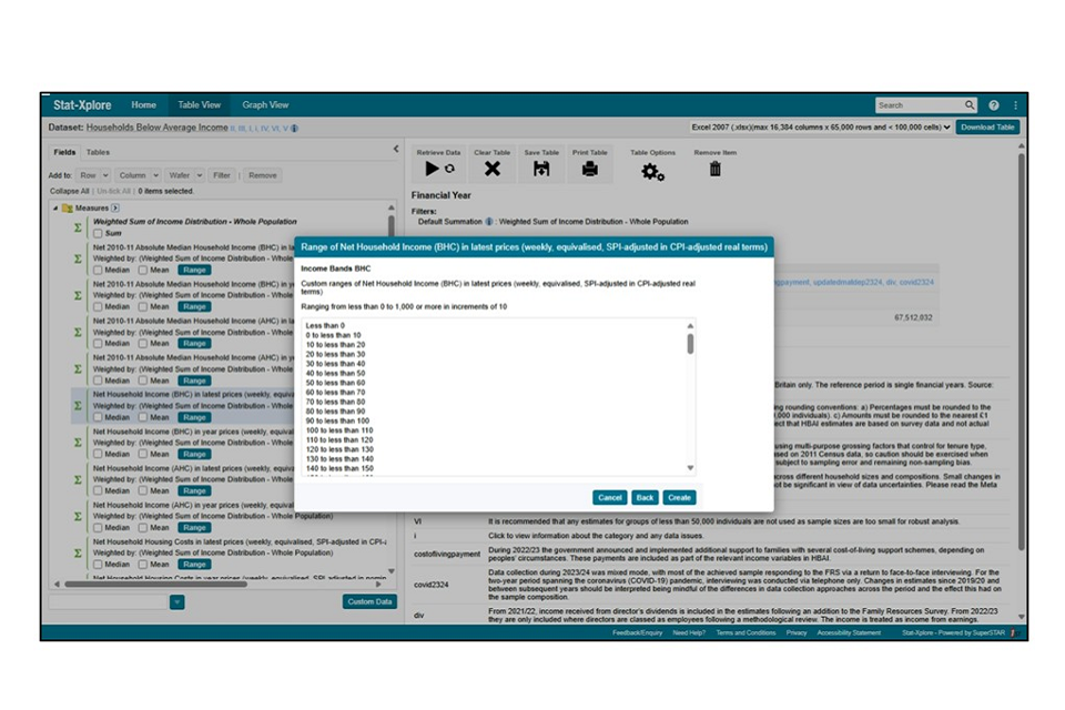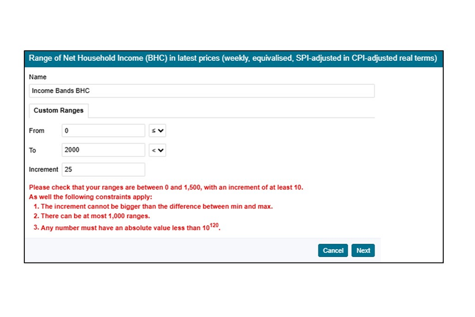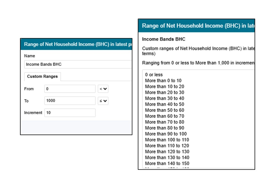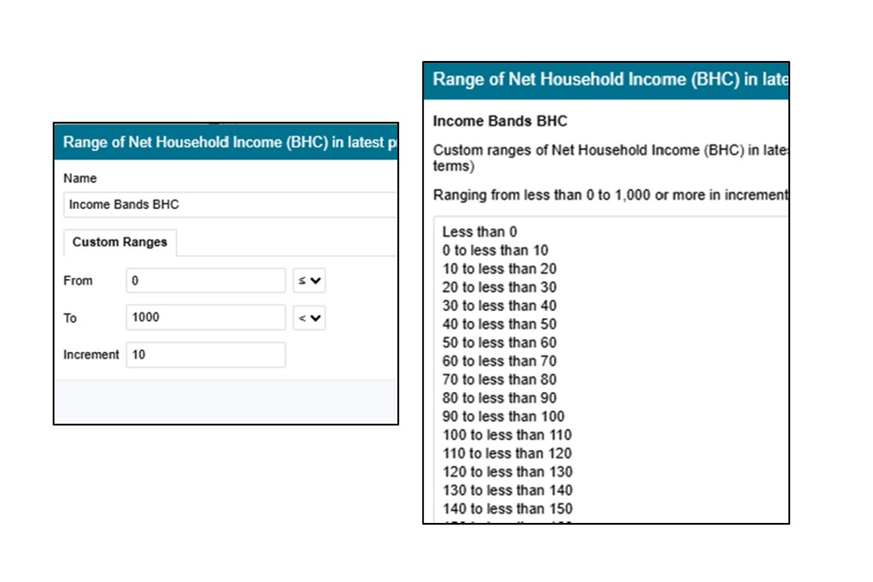 In the pop-up box, create a name and choose the minimum and maximum income amounts and the increment - for this example, the name is ‘Income Bands BHC’ (as there is a length limit) and the range selected is from £0 to £1000 per week, in increments of £10 per week.