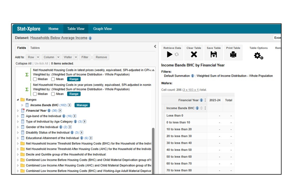 For example, to create a table presenting ‘Income Bands for Net Household Income Before Housing Costs in latest prices’: