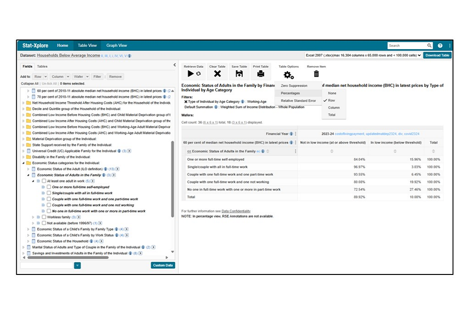 Select the ‘At least 1 adult in work’ subgroup, tick each of the categories and click on ‘Row’.