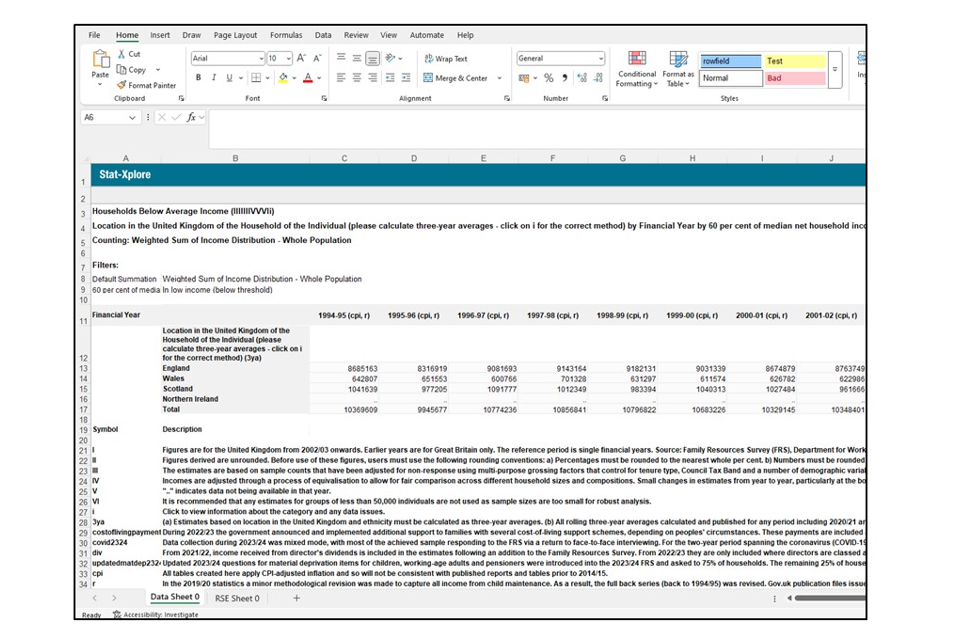 While this dataset displays estimates for single financial years, please ensure that HBAI estimates for regional, country and ethnicity estimates are calculated using 3-year averages. This method helps smooth erratic series and so give more robust estimates as the FRS sample size and coverage issues mean that single year results broken down below the level of UK region are unlikely to be reliable. For alternative sub-regional sources, please see Annex 2: Other Relevant Statistics of the HBAI Quality and Methodology Information Report which is available via the HBAI homepage.