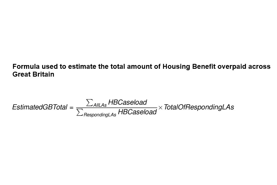 The following formula was used: Estimated Overpaid HB GB-wide = (Total HB caseload in GB ÷ HB caseload in reporting local authorities) × Total overpaid HB reported by LAs that submitted a return