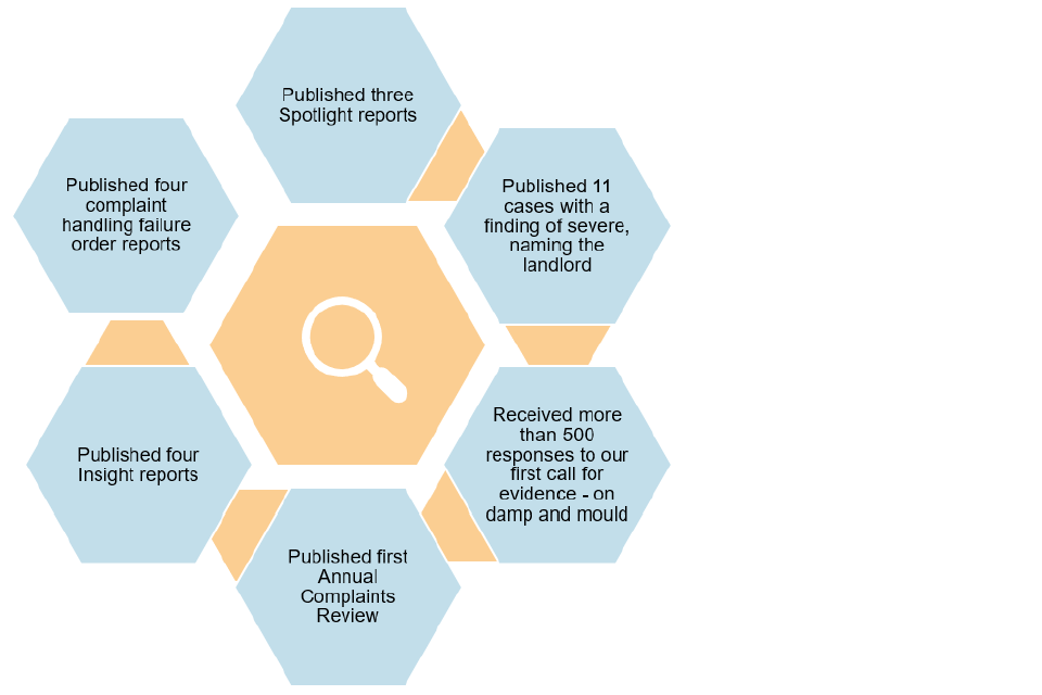 The use of our systemic powers to investigate sector-wide challenges produced reports on cladding, managing agents and, notably, damp and mould. These reports have been accessed more than 7,000 times from our website and more than 2,300 people participated in our events. It is encouraging to see such high engagement levels, which reinforces the importance of this work to provide landlords with essential support to promote professionalism. Further they help landlords consider whether their policies or approach in different service areas could be strengthened. The Complaint Handling Code was also strengthened and is proving an essential tool to promote a positive complaint handling culture.